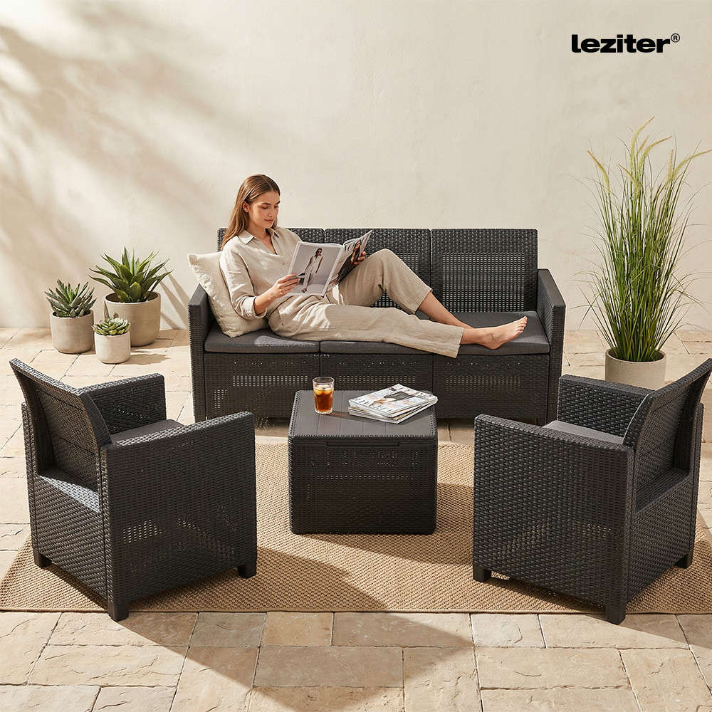 Ez egy rattan stílusra emlékeztető elegáns bútor szett két fotellel, egy három személyes kanapéval és egy párnatartós asztallal. Ez a bútor szett kellemessé teszi a kertben vagy a teraszon töltött nyári napokat. A könnyű és egyúttal stabil szerkezetű bútorok tisztítása nagyon egyszerű. A szett ellenálló a sérülésekkel és az időjárás hosszan tartó viszontagságaival, illetve az UV sugárzással szemben is.
