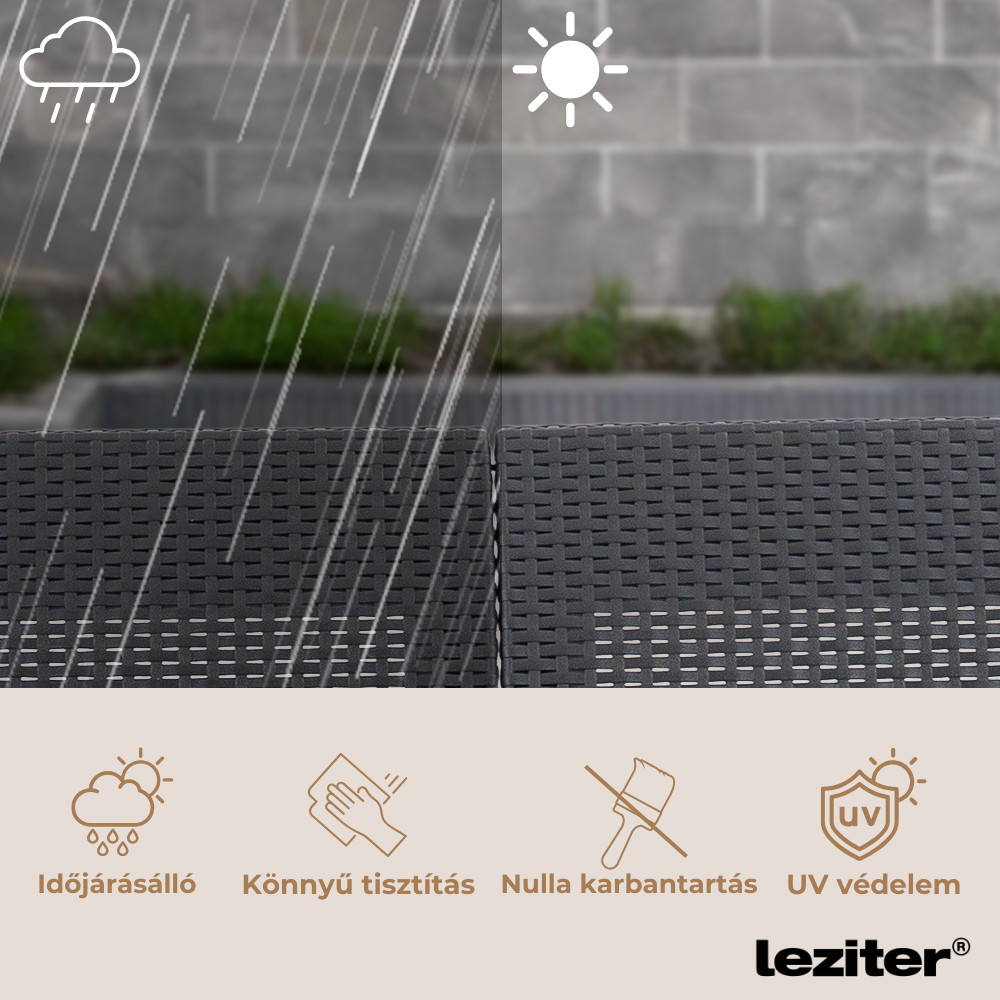 Strapabíró anyagok: A szett minőségi és tartós műanyagból készült, így ellenálló a sérülésekkel és az időjárás hosszan tartó viszontagságaVal, illetve az UV sugárzással szemben is. A Grafit színe miatt jól tűri a szennyeződést, a színe nem fakul.