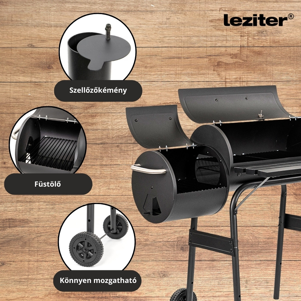 A dupla kamrás kialakítás lehetővé teszi a külön grillezést és füstölést. A füstkamrából áramló füst egyenletesen járja át az ételt, amely így gazdagabb ízvilágot kap. Az acélkonstrukció és a precíz hőmérséklet-szabályozás biztosítja a tökéletes BBQ élményt.