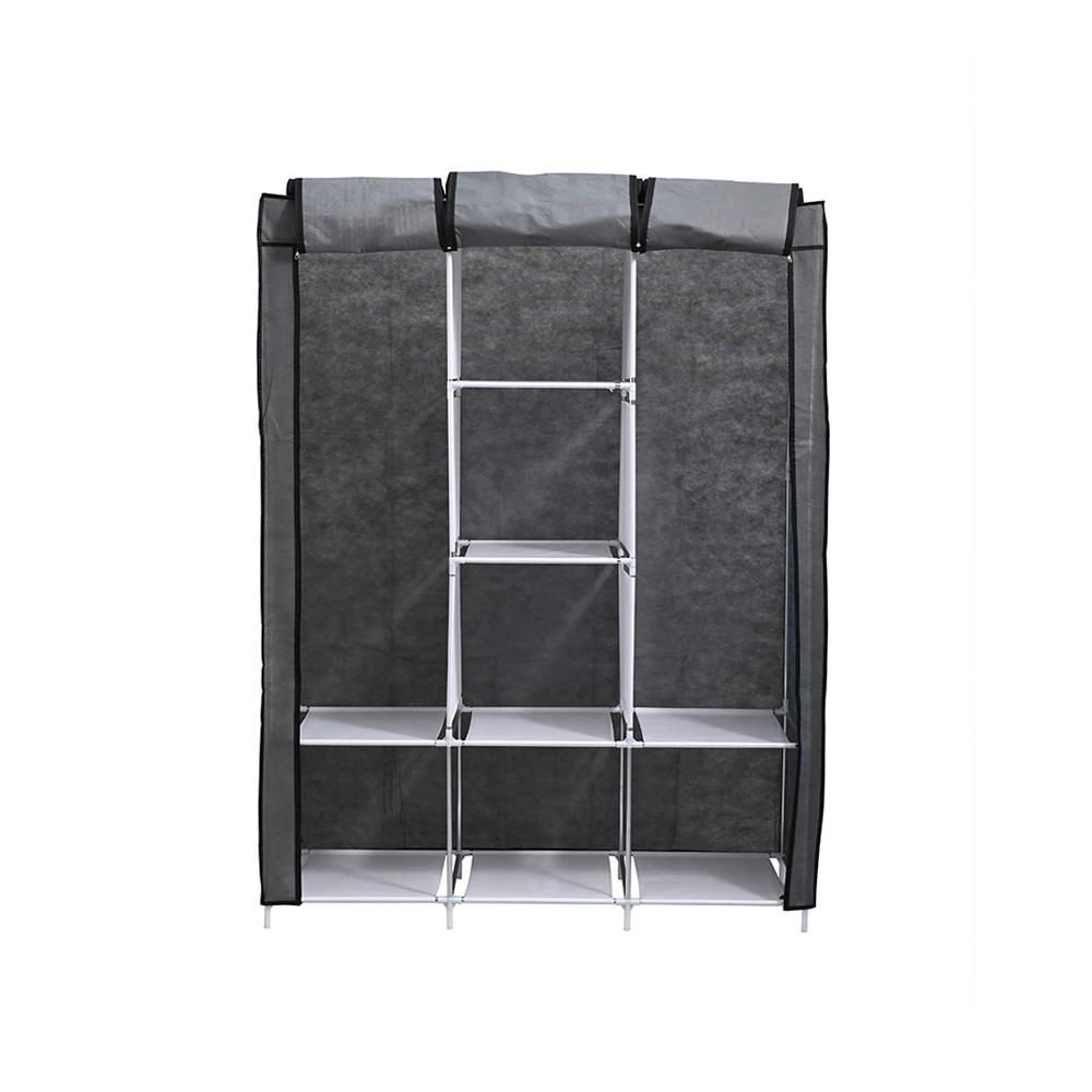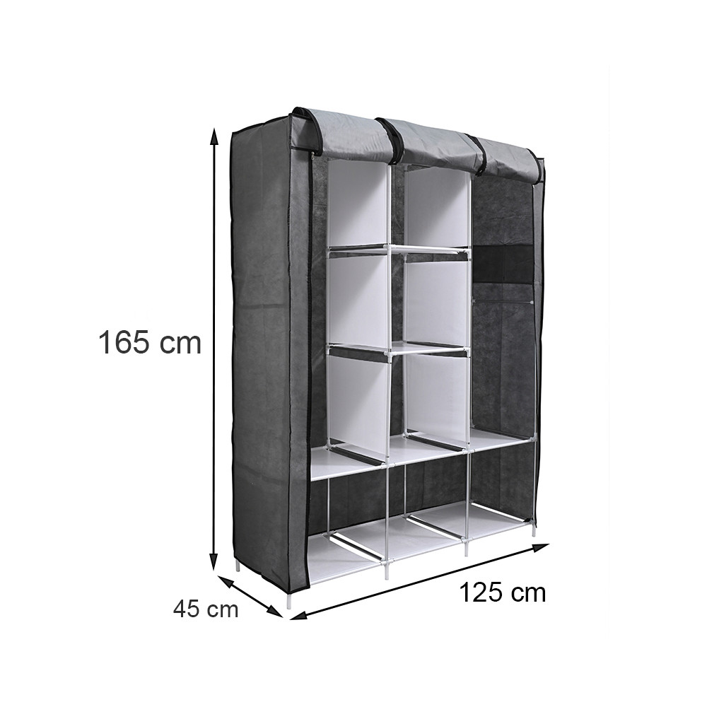 - Anyag: Tartós fémváz és magas minőségű szövetborítás, amely megóvja a ruhákat a portól. A borítás cipzáros kialakítása megkönnyíti a szekrény zárását, és biztosítja, hogy a ruhák védettek legyenek a szennyeződésektől.