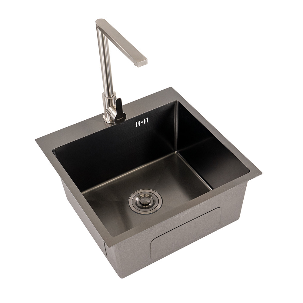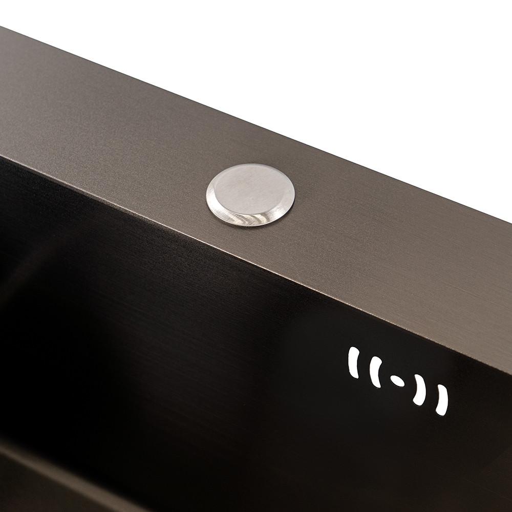 A 201-es prémium rozsdamentes acélból készült mosogató 3+0,6 mm-es vastagsága garantálja a hosszú élettartamot és az ellenállóságot a mindennapi használat során. A fekete nano bevonat nemcsak elegáns, hanem taszítja a szennyeződéseket és az olajfoltokat, így kevesebb időt kell a tisztításra fordítani.