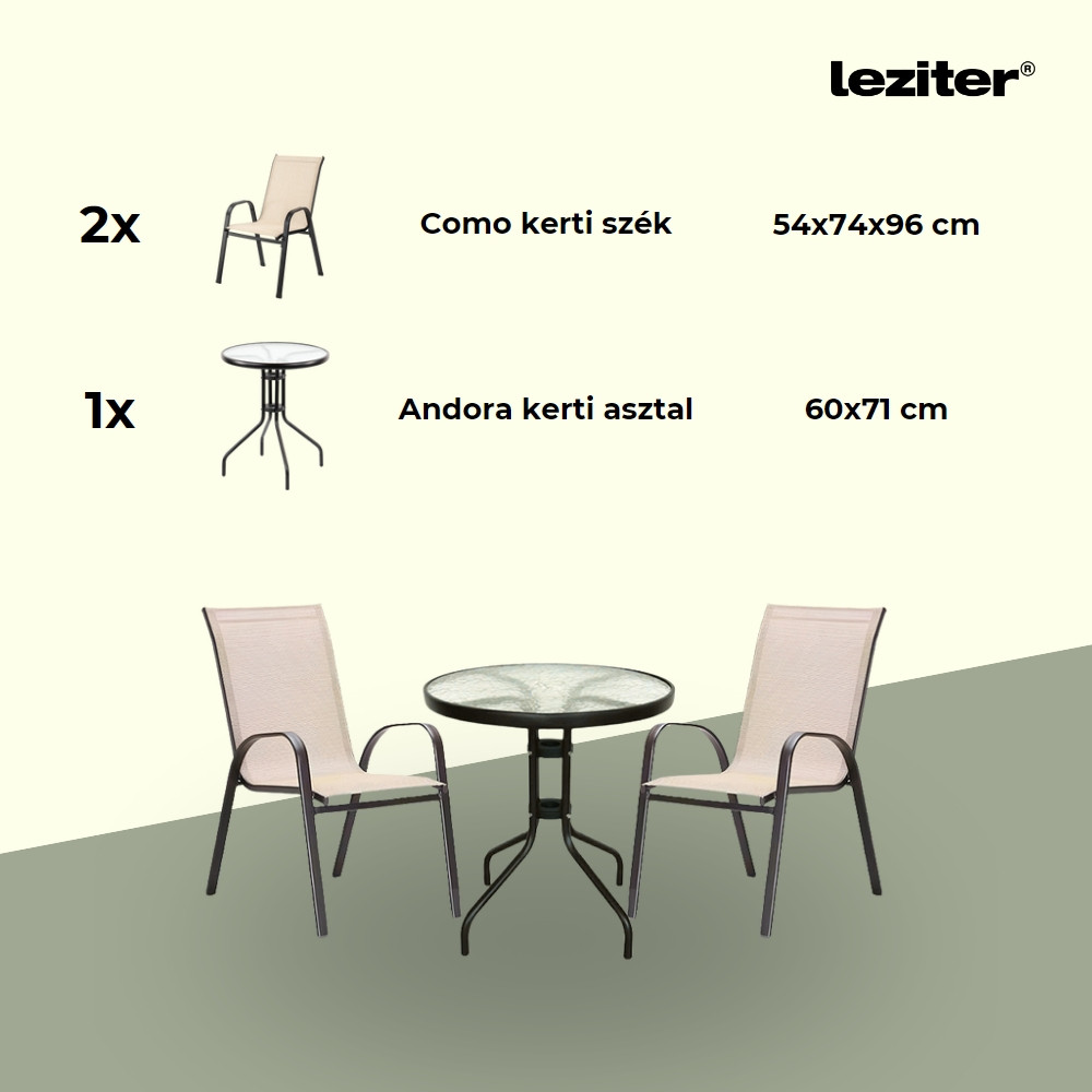 Az Andora asztal fekete fémváza eleganciát és modern megjelenést kölcsönöz, miközben tartósságot és stabilitást garantál. Az üveglap tiszta és letisztult, könnyen tisztítható. Ideális méretei köszönhetően akár négyen is kényelmesen élvezhetik a szabadban töltött időt, legyen szó reggeli kávézásról, baráti összejövetelekről vagy esti beszélgetésekről.