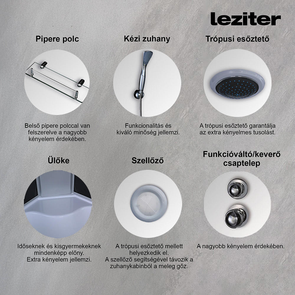 A Lia zuhanykabin számos hasznos funkcióval rendelkezik. Pipere polccal van felszerelve, melynek köszönhetően rendbe tudja tartani a tisztálkodáshoz szükséges eszközeit. Trópusi esőztetővel és kézi zuhannyal is rendelkezik, melyet a funkcióváltóval tud váltakoztatni. A víz hőmérsékletét a keverő csapteleppel tudja beállítani. A trópusi esőztető mellett helyezkedik el kettő szellőző, melyeknek köszönhetően távozik a felesleges meleg gőz ezzel megakadályozva a kabin párásodását. A kabinba 6 db hidromasszázs fúvóka van beszerelve, lábmasszírozó és rádió, melyek biztosítják az extra kényelmet. Ezeken kívűl LED és felső világítás is van a kabinban.
