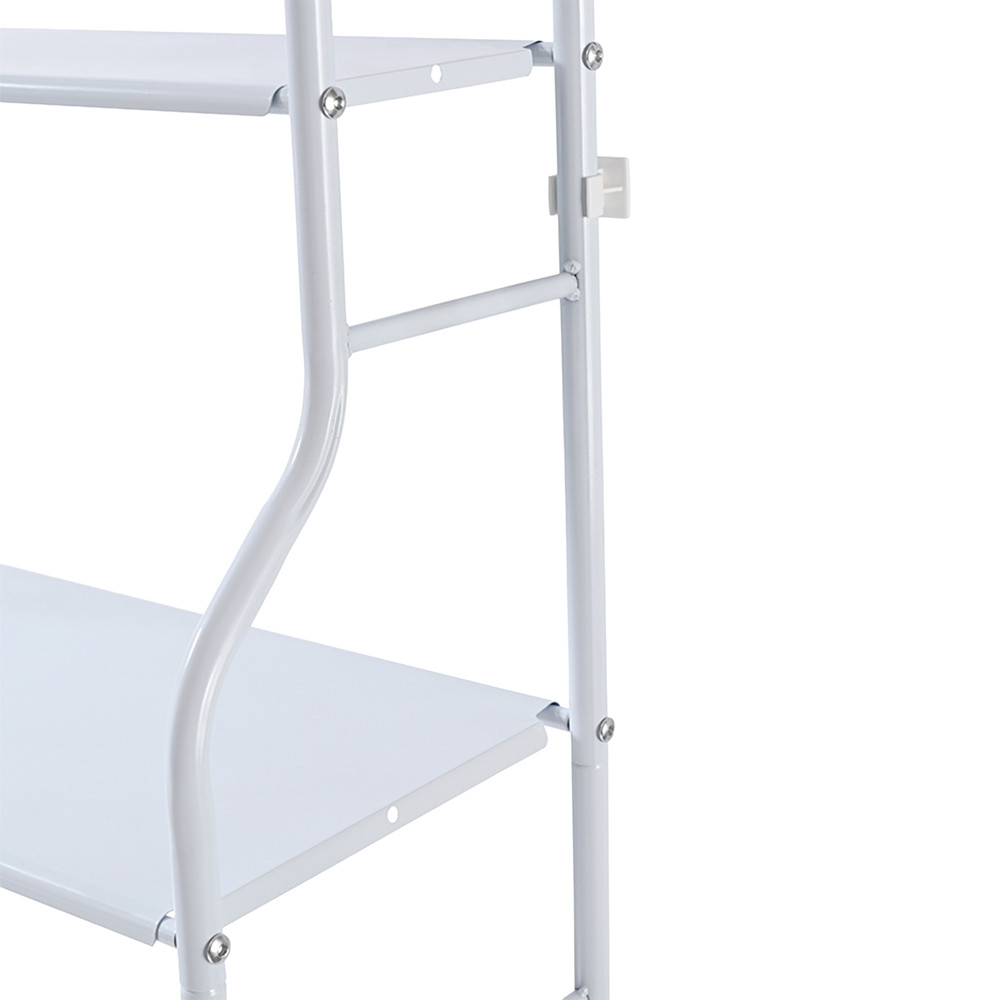 - Többszintes kialakítás: Három polccal rendelkezik, amelyek lehetővé teszik különböző méretű és típusú mosószerek, tisztítószerek és egyéb kiegészítők rendszerezett tárolását. A mosógép feletti extra hely kihasználásával további tárolóhelyet biztosít, ahol mosószert, sampont, tusfürdőt stb. tárolhatsz.