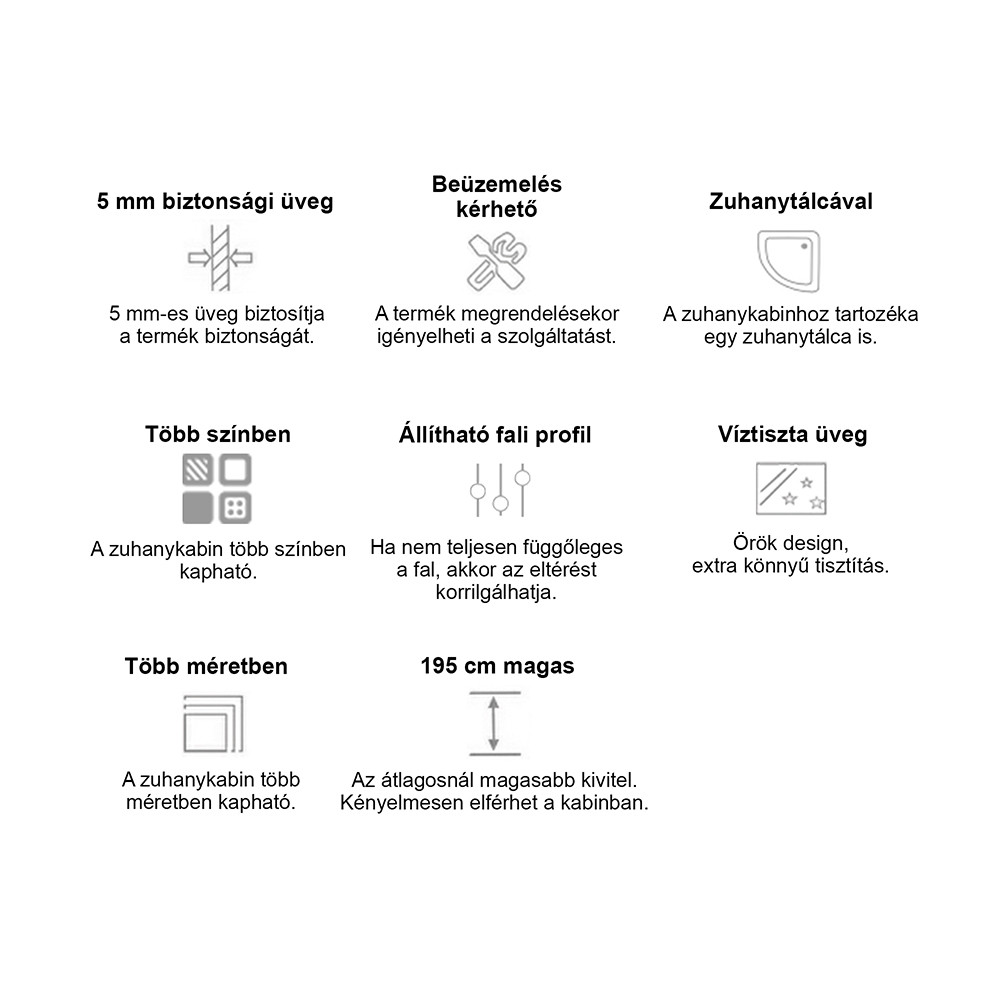- Típus: Szögletes zuhanykabin zuhanytálcával