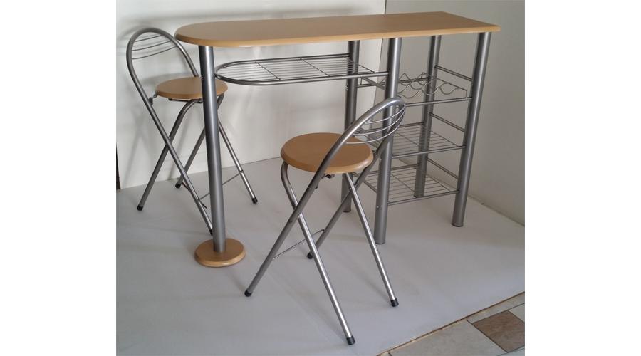 Praktikus, kis helyigényű étkező szett, mely 2 db összecsukható széket és egy pultot tartalmaz. A pult alsó részén fém tároló polcok vannak kialakítva, köztük egy kifejezetten italok tárolására alkalmas polccal.