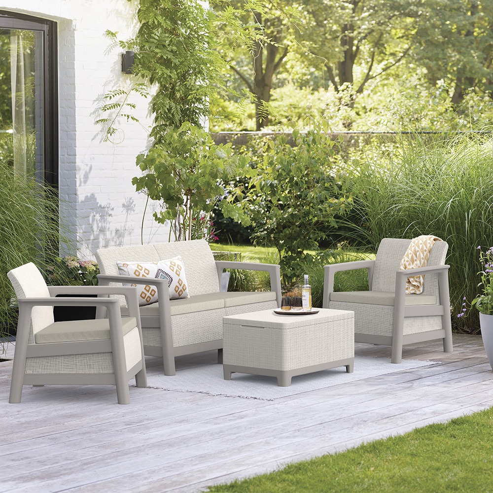 A szett kényelmes beszélgetősarkot alakít ki a kertben vagy a teraszon. Egységes, modern kültéri nappali hozható létre vele, miközben a tárolós asztal praktikus helyet biztosít a kiegészítőknek. Időjárásálló, gondozásmentes megoldás, amely rendezetten és átgondoltan formálja a kültéri teret.