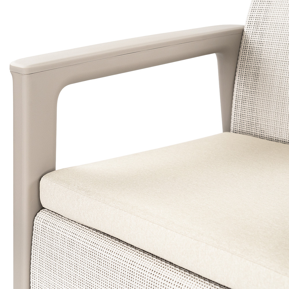 A Scandi linea 2 személyes kerti kanapé letisztult, egységes formavilágot képvisel. A kavicsszürke-bézs árnyalat texturált felület természetes megjelenést biztosít, amely jól illeszkedik zöld környezethez és modern kültéri burkolatokhoz. A két fotelből álló összeállítás harmonikus ülőhelyet teremt teraszon, kertben vagy tágas erkélyen, miközben a visszafogott színvilág könnyen kombinálható más Scandi elemekkel.