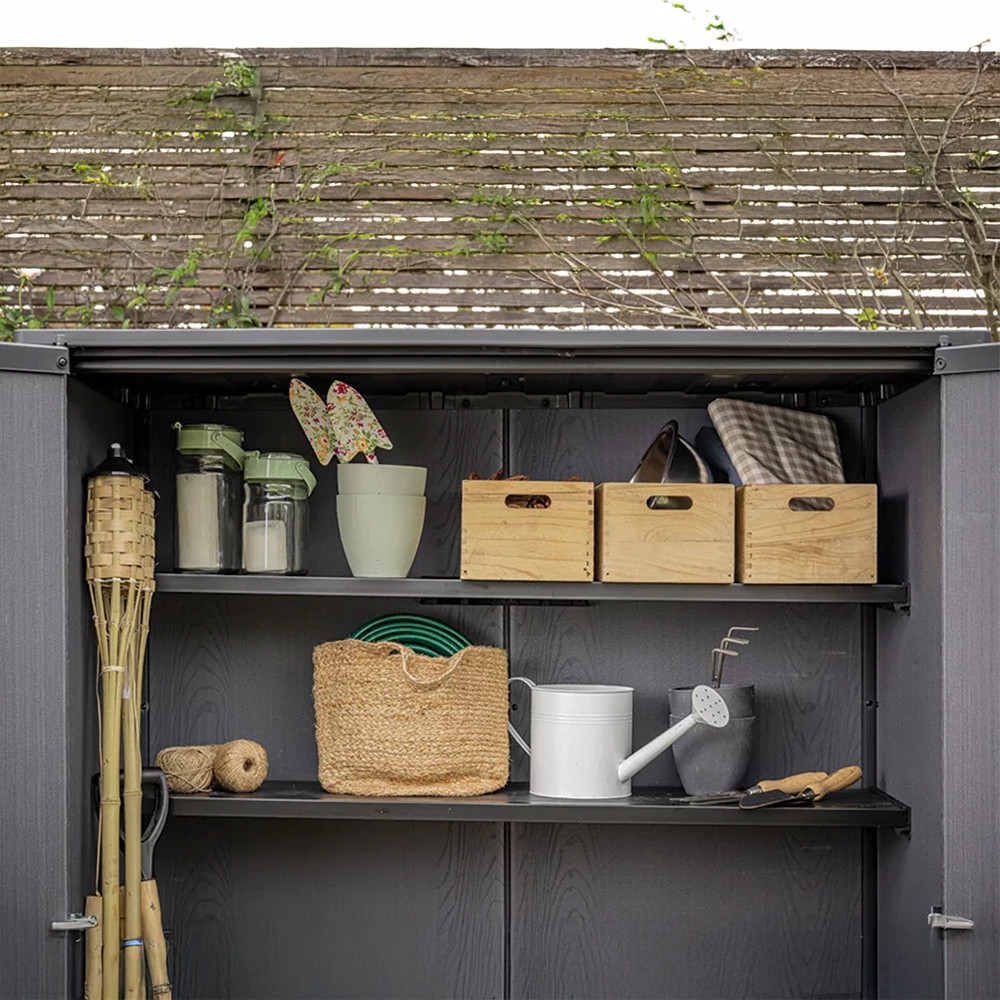 A Signature 1400L kerti tároló tökéletes megoldás, ha egy stílusos, tartós és biztonságos kültéri tárolóra van szükség. Az innovatív DECoCOAT™ technológiának köszönhetően természetes fa hatást kelt, anélkül hogy fakulna vagy karbantartást igényelne.