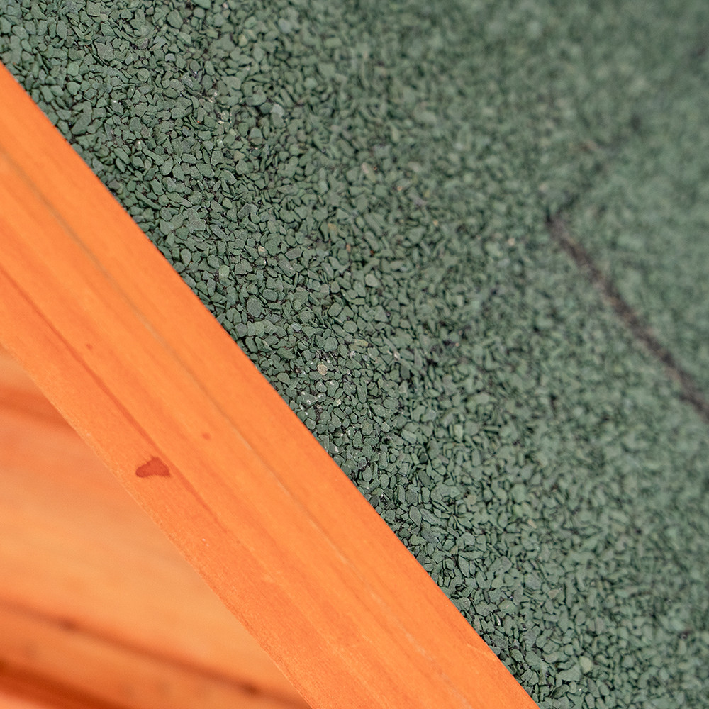 A kutyaház teteje tégla hatású, homokolt kátránypapírral van borítva, ami biztosítja az időjárásállóságot és extra védelmet nyújt. A széles tetőtúlnyúlások a külső oldalakat és a bejáratot is védik az esőtől, széltől és hidegtől. Az átlátszó lamellás ajtó ideális esős időben és véd a huzattól.