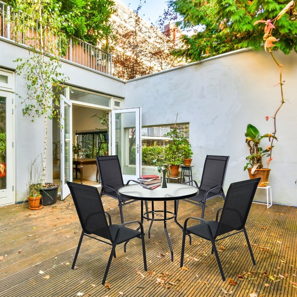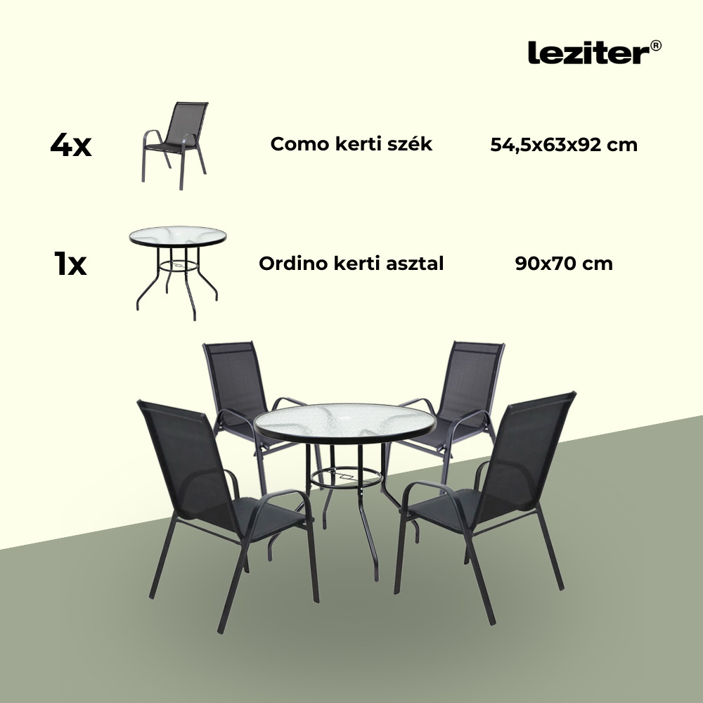 A modern kivitelű kerti bútorkészlet egy kerti üveglapos asztalt és 4 széket tartalmaz, melyek teherbírása 120 kg. A bútorokat 4 fő számára tervezték. A székek és az asztal lábazata acélból készül. Az asztallap 5 mm-es edzett üvegből készült, amely ellenáll a kisebb karcolásoknak. Az textilén szék ülésanyaga ellenáll az időjárási viszonyoknak. Előnye az ergonómikusan profilált ülés és karfa, amelyek tehermentesítik a vállakat pihenés közben.