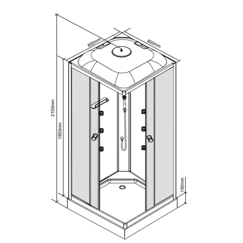 - Magasság: 185 cm (kabin), 215 cm zuhanytálcával együtt