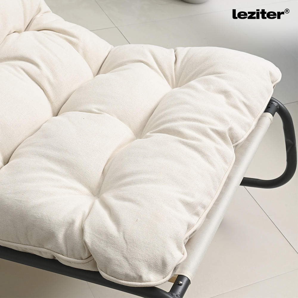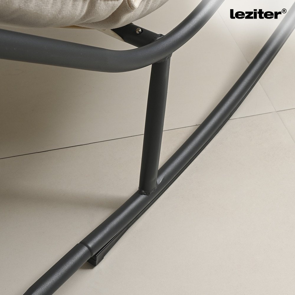 A Zen hintaszék ülőfelülete vastag habszivacs párnázással készült, amely kényelmes alátámasztást biztosít ülés és pihenés közben. A poliészter huzattal ellátott, tűzött kialakítású párna segít a forma megtartásában, miközben puha és komfortos felületet nyújt rövidebb vagy hosszabb relaxációhoz is. A bézs színű párnázat visszafogott, semleges megjelenést ad a hintaszéknek, amely könnyen illeszthető különböző stílusú környezetekbe, legyen szó kerti pihenősarokról, teraszról vagy beltéri lounge térről. A világos ülőfelület és a fekete acél váz kontrasztja modern, letisztult összhatást eredményez.